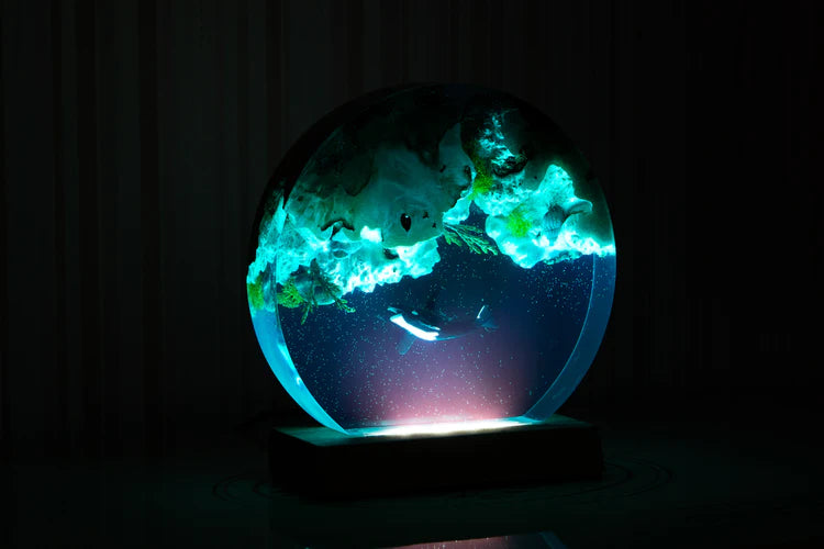 Jede Leuchte wird in sorgfältiger Handarbeit gefertigt – aus ausgewählten Hölzern in Premiumqualität, natürlichem Epoxidharz und liebevoll arrangierten Dekorelementen.