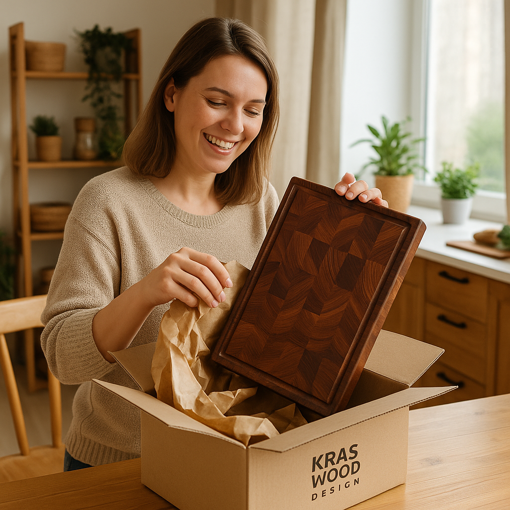 It’s a completely different story with a KRAS WOOD DESIGN end-grain cutting board. This is not just a kitchen tool — it’s a reflection of taste, respect for natural materials, and love for detail. Handcrafted from solid hardwood, this board will serve you for decades, retaining its shape, beauty, and function.